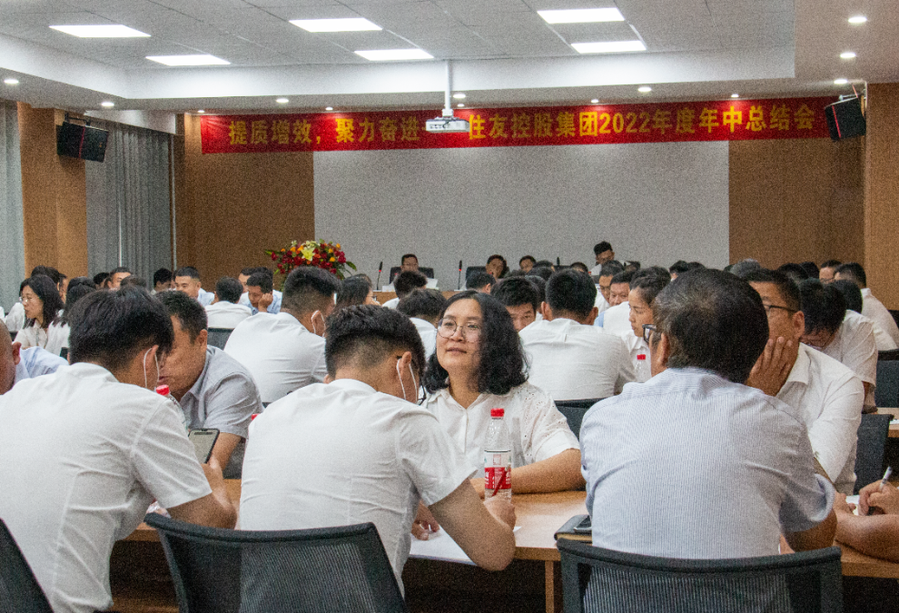 2022年7月23日,以“提质增效,聚力奋进”为主题的住友控股集团2022年年中工作会议隆重召开。住友控股集团董事长张红泽、总裁王智伟等集团公司领导班子成员,各职能中心、 各项目、公司负责人,中层管理人员等100余人参加了会议,超800名员工以线上视频会议参加。
