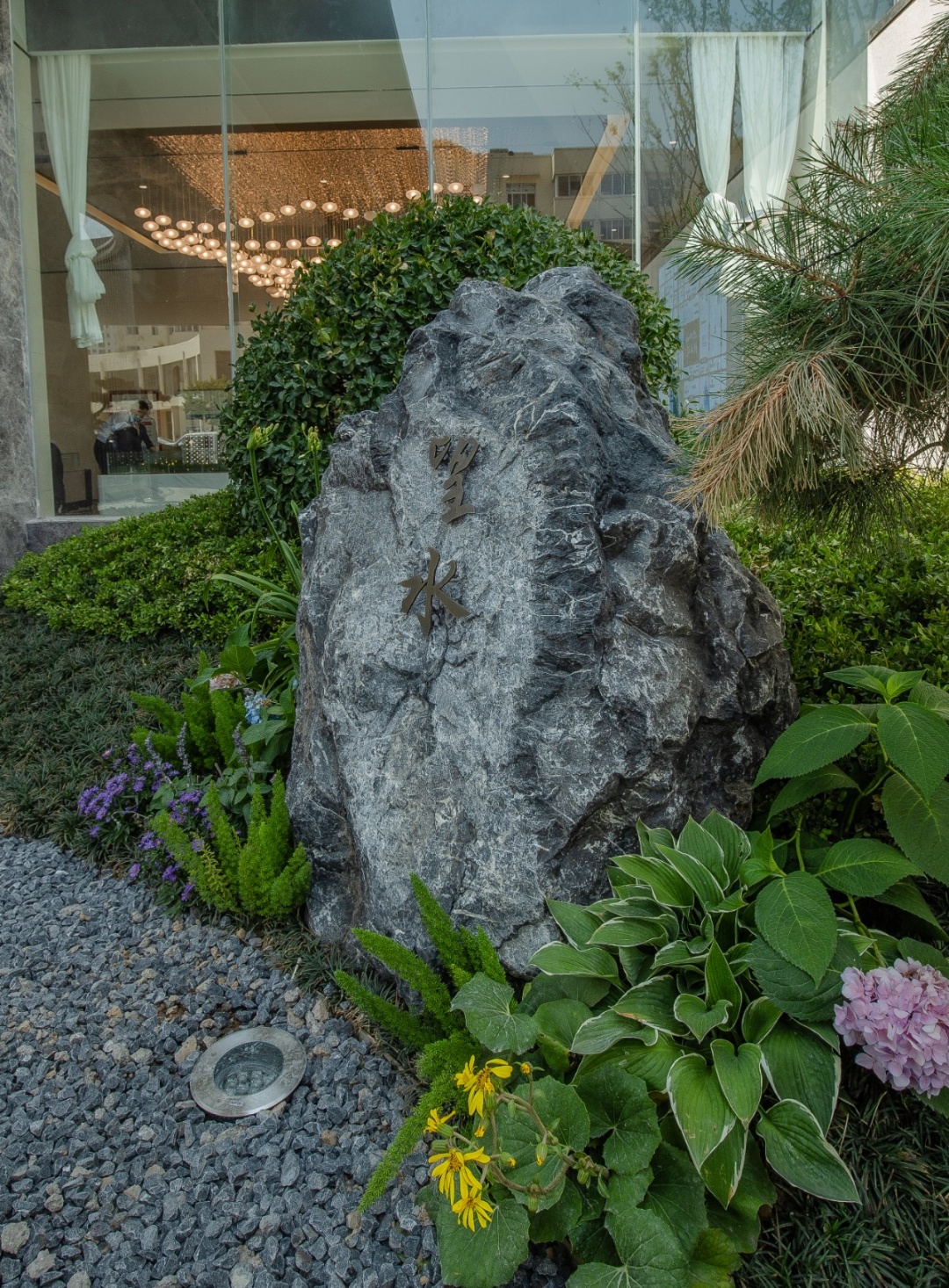 内庭院,运用山水置石手法,用静态的手法描绘动态景观效果,平面上又犹如行云流水的书法,荡气回肠的河流,表达自然和谐的生活环境。
