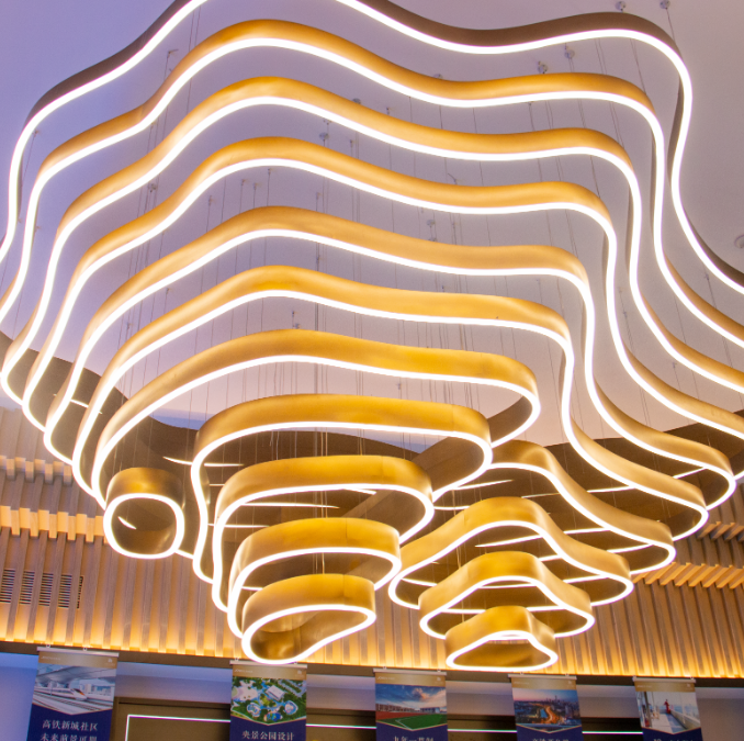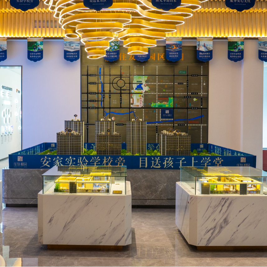 沙盘区线条简洁利落,色彩靓丽,上方的吊灯宛如蜿蜒起伏的山脉,将自然人文融入空间,传统与现代相汇,在光的映衬下,把生命的张力保持在特定的空间,给人强烈的视觉冲击力,展示着美好、稳稳的幸福生活触手可及。