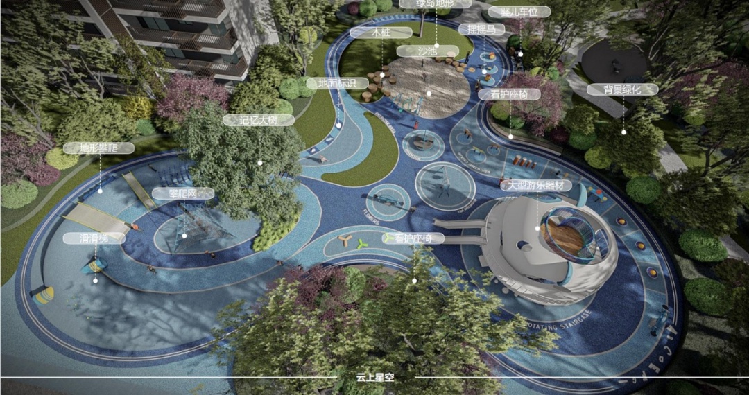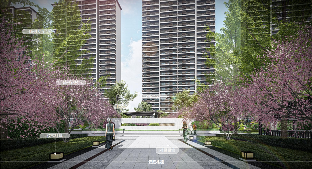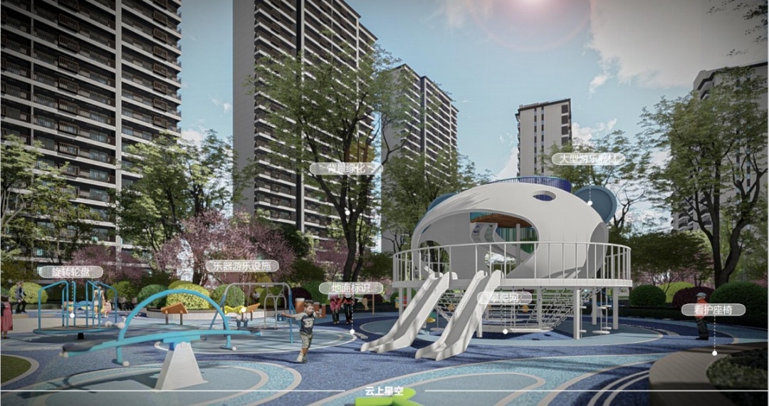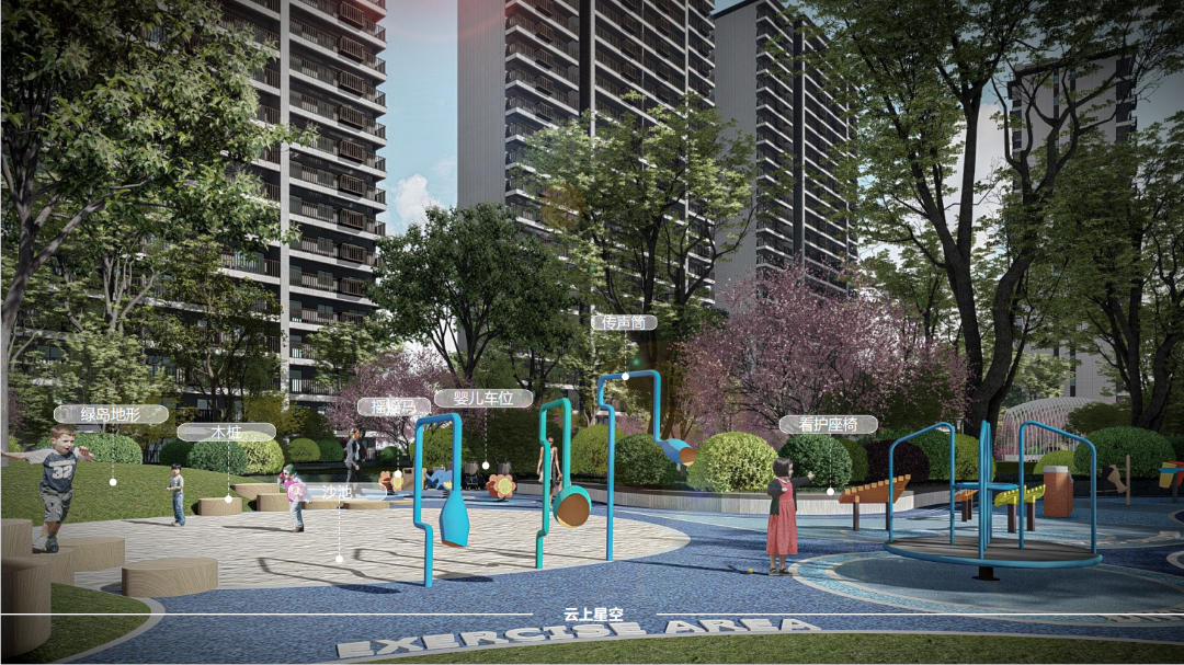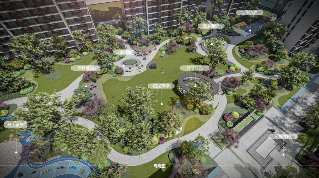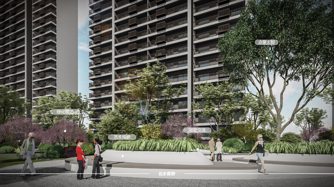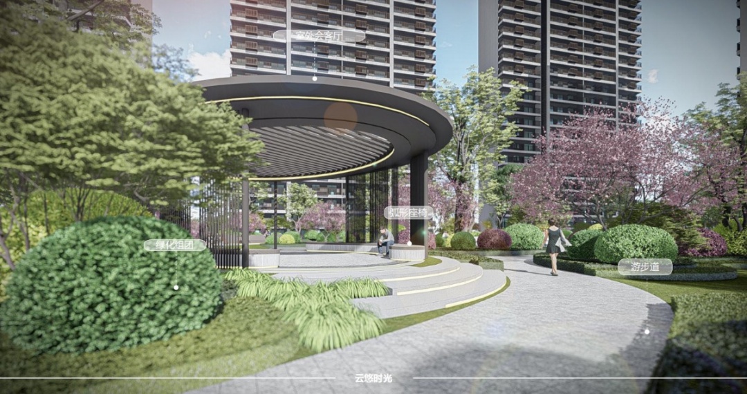 整个小区由阳光大草坪、室外会客厅、邻里会客花园、全龄儿童活动空间、健康跑道等组合而成,以一朵云的旅行为故事线,生成了“云”享多彩生活的主题理念。在构造物,植物、绿篱、铺装等的艺术布局下,创造出一个精致唯美的庭院空间,极大丰富了空间感,让后期业主的生活能充分融入园林之中,打造出深厚的邻里情谊,纵享无限风景。