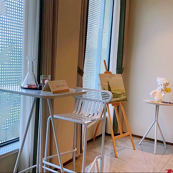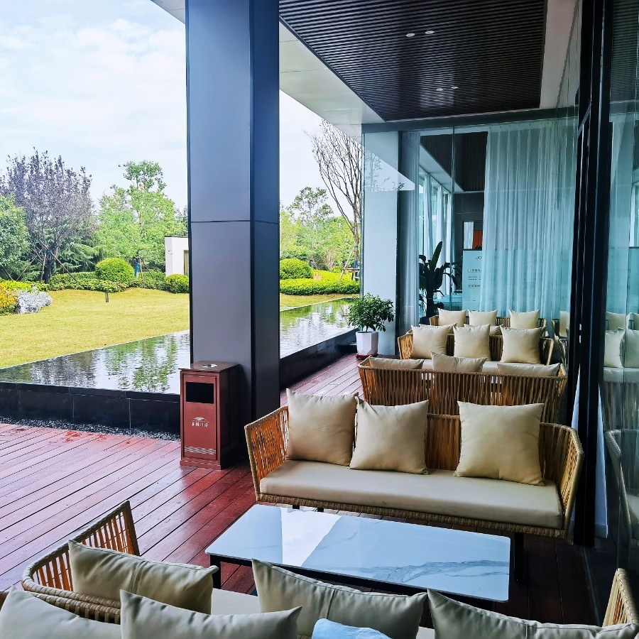 室外的洽谈区以最简洁纯净的方式实现对生活艺术的直接表达,满足精致纯粹空间的气质输出。我们可以在此休闲阅读,与三五知己品茗,亦可跟营销人员畅想未来府院般的美好生活。